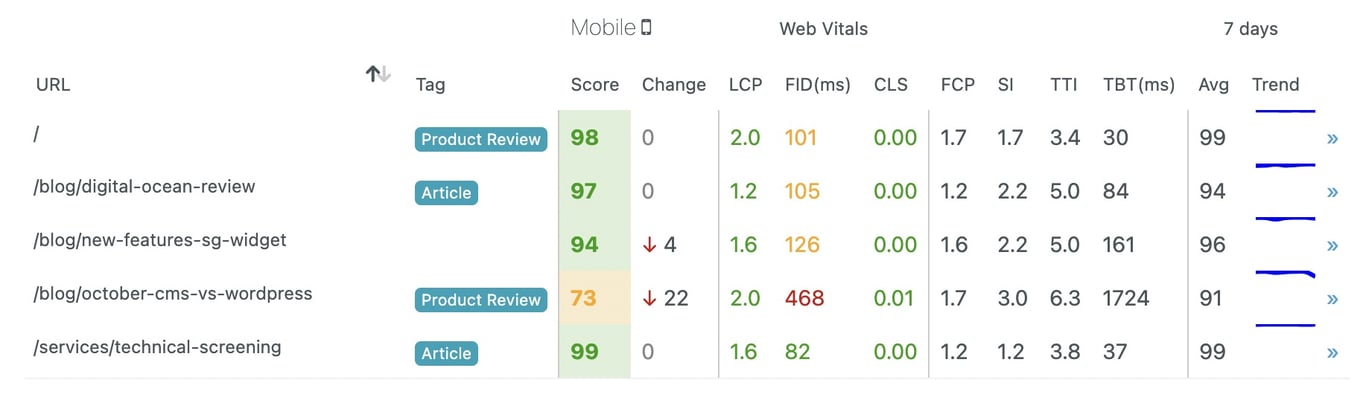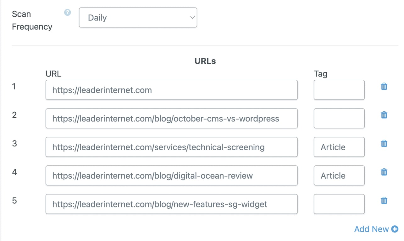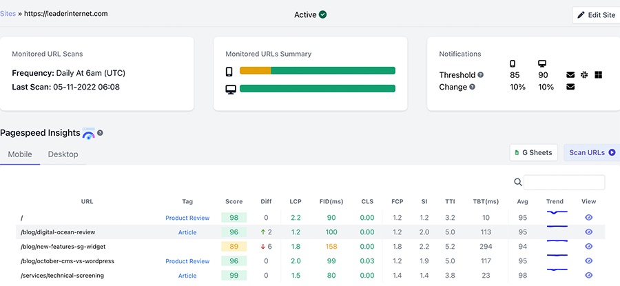 Monitored URLs allow you to track a list of URLs and have them scanned automatically every day or week. Each URL is scanned in depth 3 times on desktop and 3 times on mobile to get an average score, which is a better reflection of the true grade rather than scanning just once.