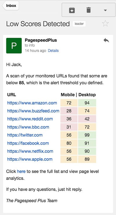 You can set the scan frequency and forget about it. From that point on we will test your URLs and notify you if they are slow. If you don’t hear from us, it generally means your PageSpeed Score is good. If you do then you need to take some action.