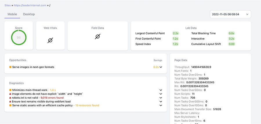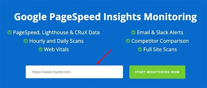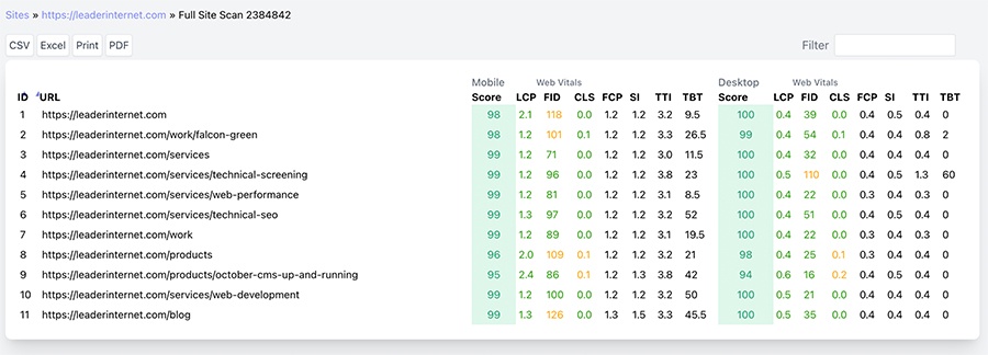 Full Site Scans provide the ability to scan your ENTIRE website instead of a random selection of pages. This means you can see the Google PageSpeed score for every single URL on your site and get greater visibility into your PageSpeed score across your entire domain.