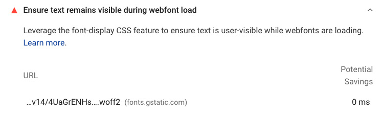 If you are using a Google Font, it’s even simpler than the method described above and no CSS code changes are required. Just add &display=swap onto the end of the URL and font-display will automatically work.