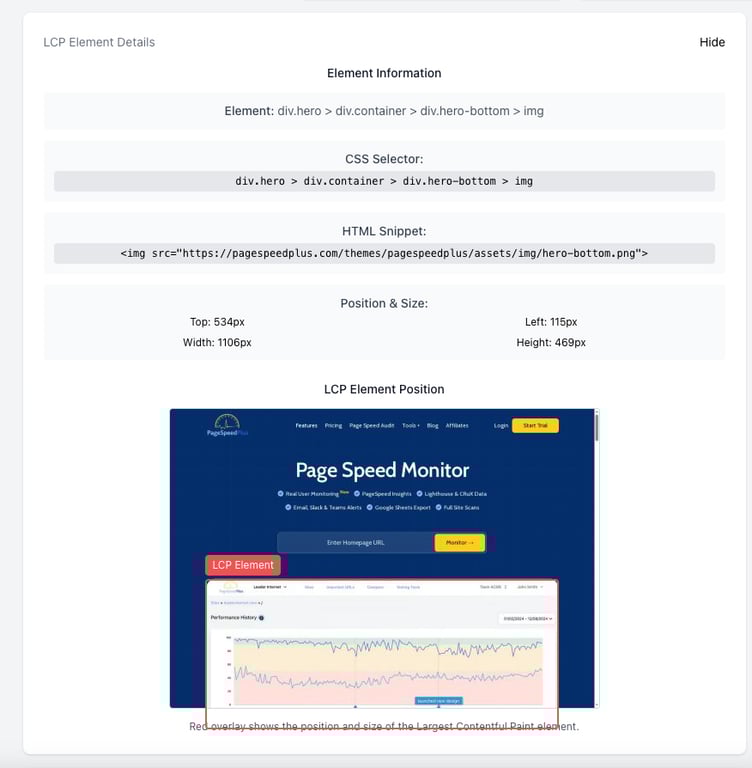 PageSpeed Plus surfaces the Largest Contentful Paint Element of a page every time it scans a URL. It does this for mobile and desktop and presents these in the dashboard for you to see.