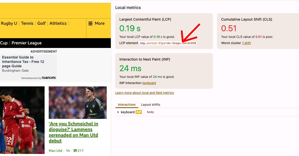 Anoter method of LCP identification is Chrome DevTools which provides the most direct method for identifying LCP elements. The Performance panel offers real-time LCP tracking showing exactly which element contributes to your score. Open DevTools, navigate to Performance, and record a page load with "Web Vitals" enabled.