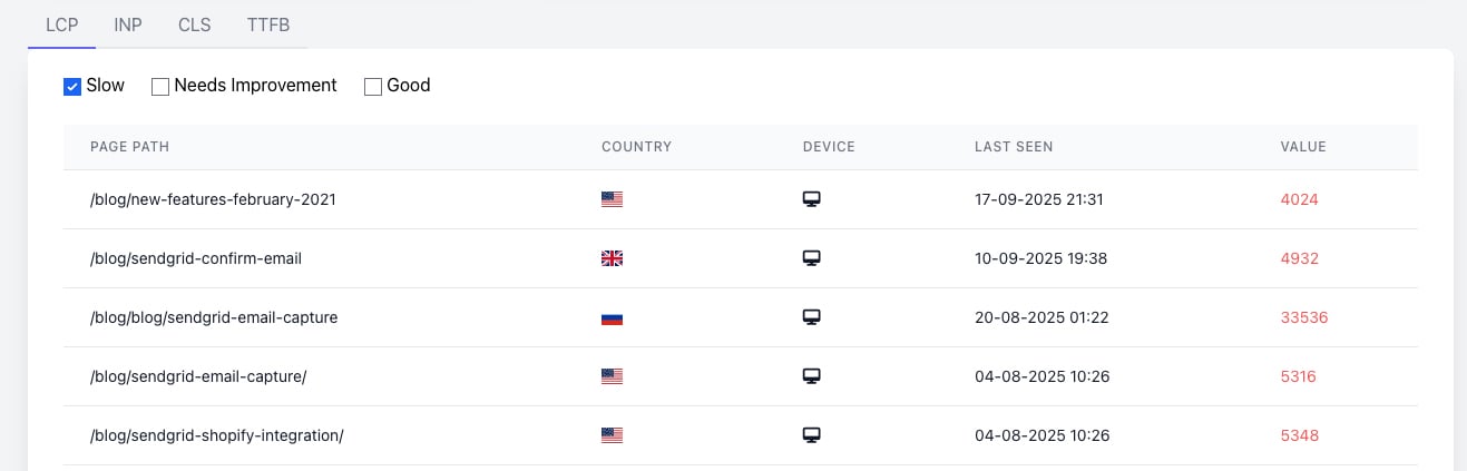 In addition, the Real User Monitoring (RUM) feature collects LCP data from actual visitors, reflecting real-world conditions including varied network speeds and device capabilities. It shows you the exact URL and location a user visited from so you have all the information needed to debug properly.