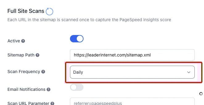 The Cc field used for notifications under monitored URLs is also used for full site scans. Any address entered here will be notified when full site scans are complete.