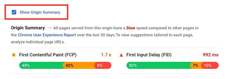 A hidden feature is Origin Summary which can be shown by clicking a checkbox. This provides the CrUX assessment of the entire domain rather than the single page that was tested.
