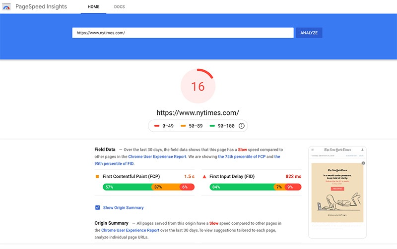 PageSpeed Insights is the best source of information for how people are actually experiencing your site. A URL could score highly in other tools like Lighthouse or WebPageTest that only run synthetic analysis but the reality is people access the internet on lots of device types, with different speeds and inconsistent network conditions. Getting a top score in Lighthouse doesn’t necessarily mean a user commuting home from work with a 3G connection will experience fast loading times.