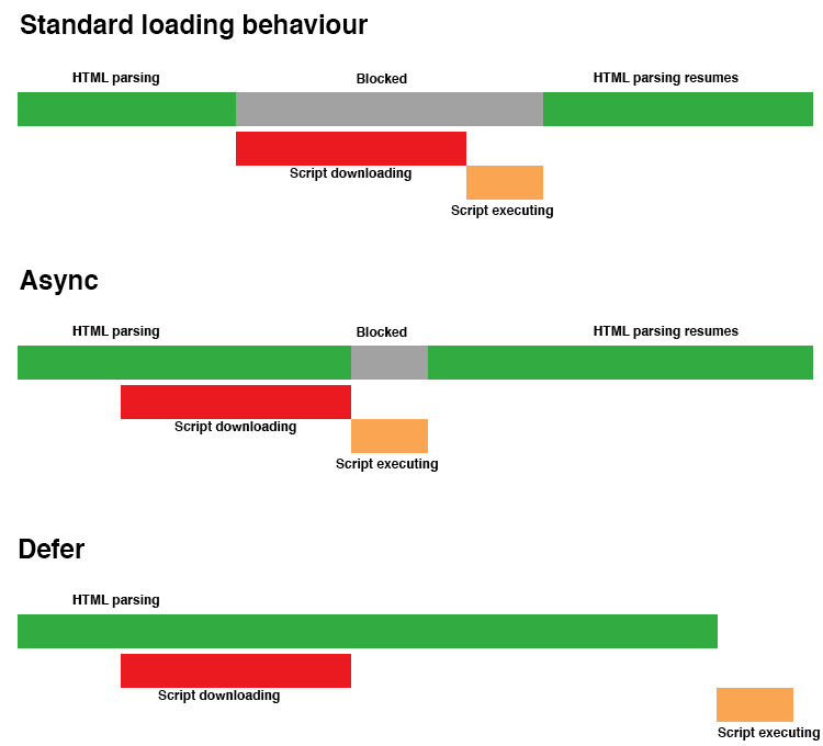 Using these attributes can dramatically improve loading speed. Defer offers the largest potential gains because the code is downloaded in the background and execution is postponed until all HTML parsing is complete. Therefore, interruption to the user journey is minimal.