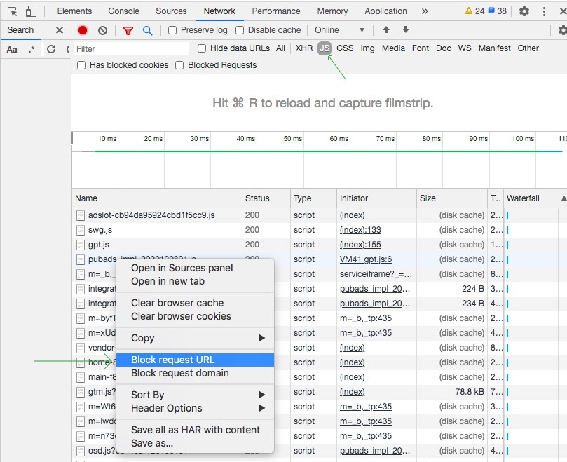 Go to Network > JS > right click on a script > Block request URL.