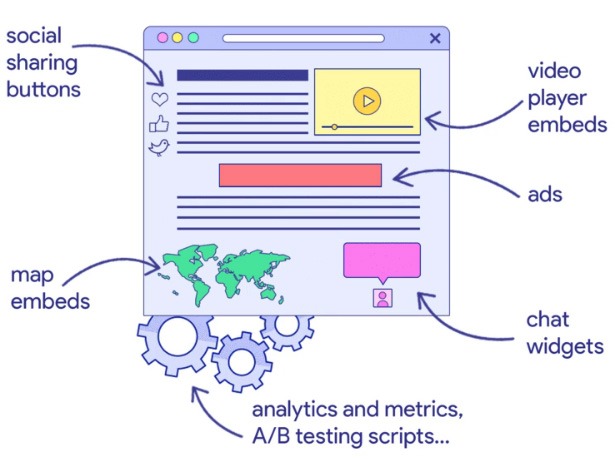 Analytics, tracking, advertisements, A/B testing and social share buttons are key components of websites - it would be very difficult operate a blog without knowing how many people are viewing it or which content is performing best. This functionality is added to sites by pasting a script tag into the HTML from a third party such as Google.