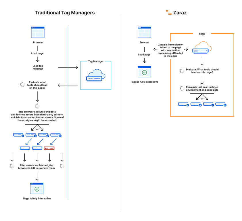 When a webpage is then loaded, a single zaraz script is injected into the HTML. This fires a request to zaraz, which executes the previously defined tools in the Cloudflare network without anything happening on the webpage. This dramatically improves performance without any loss of functionality.