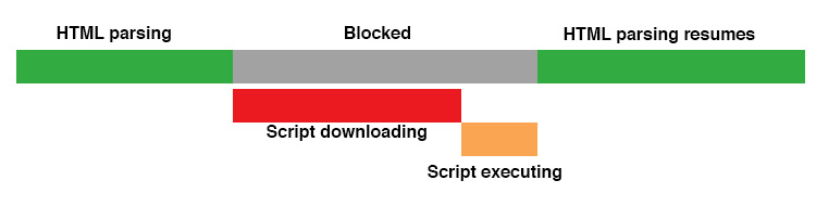 By default, script tags are render blocking resources - when a browser encounters a script tag while processing a page, parsing of the HTML is interrupted while the script is downloaded and executed.