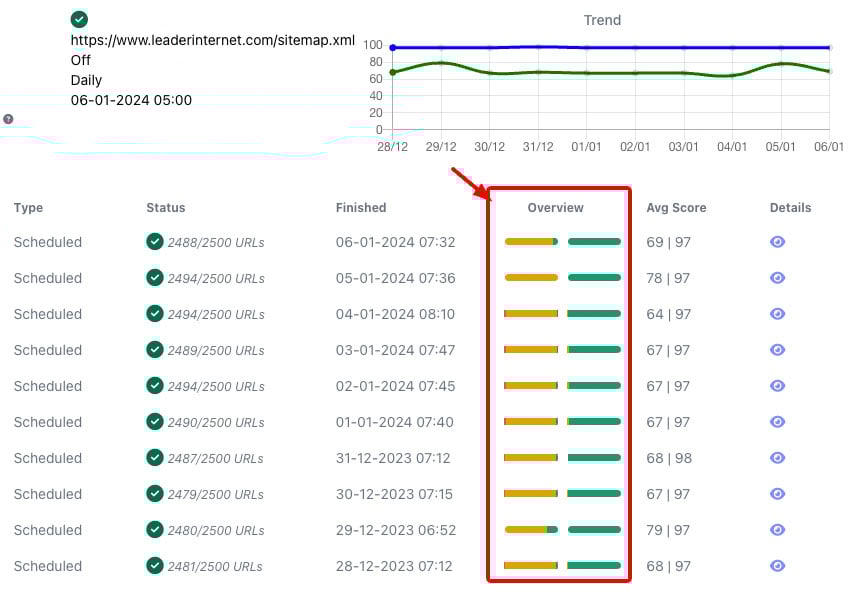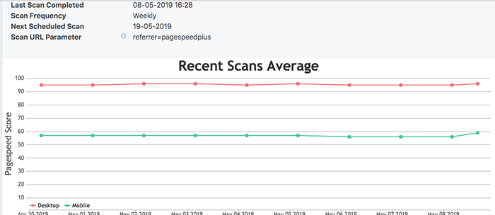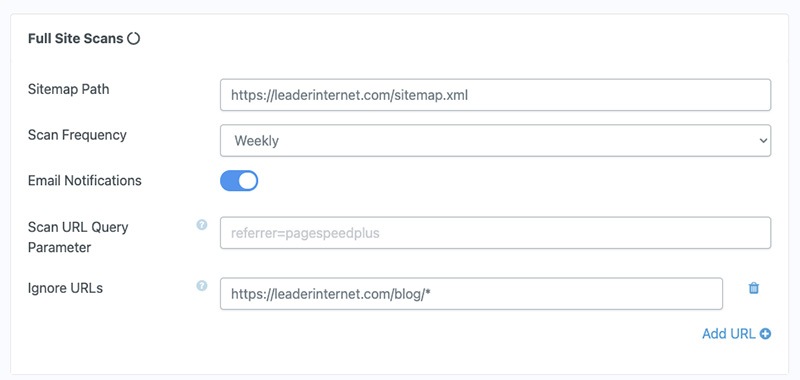 It allows you to scan your entire website daily, weekly and on demand. These scans can be set to run on a schedule or triggered manually when you decide. When a scan starts, we grab every URL in the sitemap.xml and pass each one through the PageSpeed API for mobile and desktop. If you wish to enter a manual list of URLs, that is possible also.
