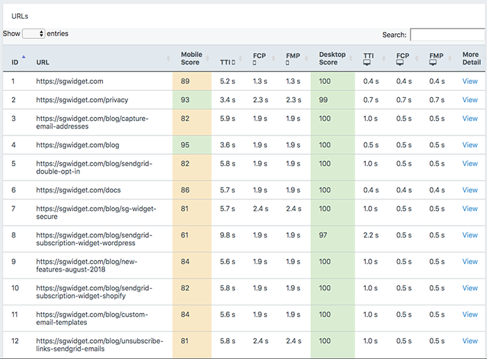 Every page listed in your sitemap.xml file will now be measured with the PageSpeed Insights API. Obviously, the more pages your site has the longer it lasts but we can do multiple URLs in parallel to accelerate the process. You can see the progress and view pages as they complete.