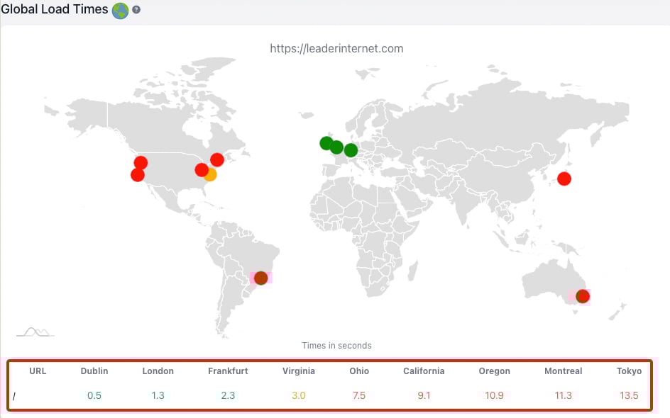 The homepage will now be scanned. When finished, click into the website record and you will see loading times for the URL from a variety of global locations: