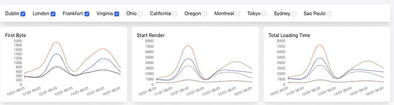 As you can see, loading times are not consistent around the world. This could be due to factors outside the control of the website like telecommunications infrastructure in the target location but a large amount is within their control like server configuration, caching, API calls and on-page javascript. This chart helps to track speeds from multiple regions and identify subtle differences that can have a big impact on user experience.